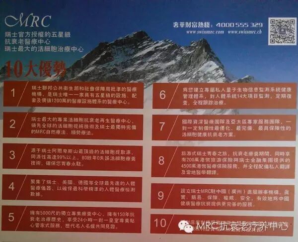 如果您想要了解更多涉外医疗市场、想要致力于活细胞抗衰老、想要更近距离探索生命的不老传奇……瑞士MRC活细胞抗衰老再生医疗中心驻中国(广州)办事机构于2015年3月9日—10日广州香格里拉酒店商务中心会议厅,敬候您的莅临!