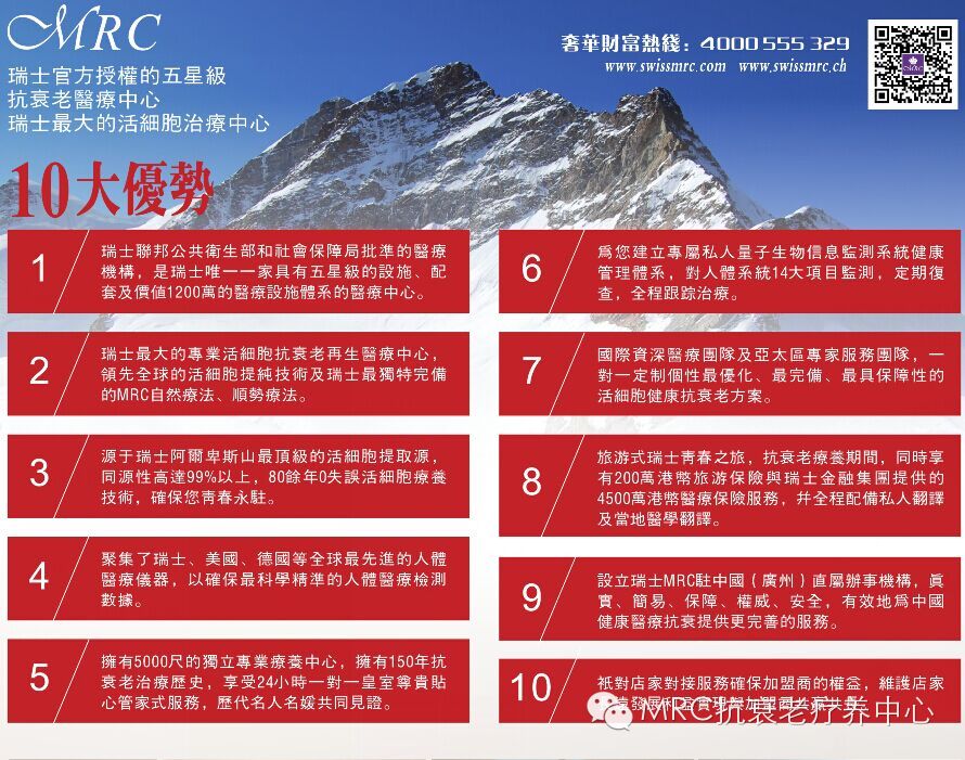 瑞士蒙特勒(MRC)健康抗衰治疗中心的优势在于继承并超越了瑞士传统的小羊胚胎肝脏精华素疗法,运用瑞士先进的生物科学技术,萃取、精炼和提纯全器官活细胞,可以针对不同的衰老器官及其衰老程度进行个性化活细胞疗法。瑞士MRC独特的自然疗法、顺势疗法,包含:SEQEX生物磁场疗法、摩卡排毒、光氧排毒激活疗法、淋巴排毒治疗、脂肪分析检测仪、生物光抗压治疗、超光子治疗、全方位焕颜治疗、结肠水疗、能量水治疗等,有效带动使用活细胞后得到更好的疗效,让您进行360°抗衰老理疗,全方位活力焕颜!