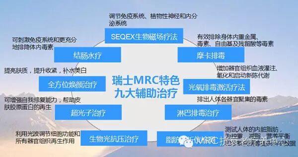 瑞士蒙特勒(MRC)健康抗衰老再生医疗中心涵盖了接待中心、检测中心、疗养中心、休闲中心、水疗中心、健身中心等,并集癌症排查、疾病预防、重症治疗、抵抗衰老、健康管理、医学美容于一体的医疗体系,将抗衰老治疗与顺势疗法、自然疗法等多治疗的完美结合,以及重视每一位高端客人的个体差异,为客人提供全方位的抗衰老医疗服务。