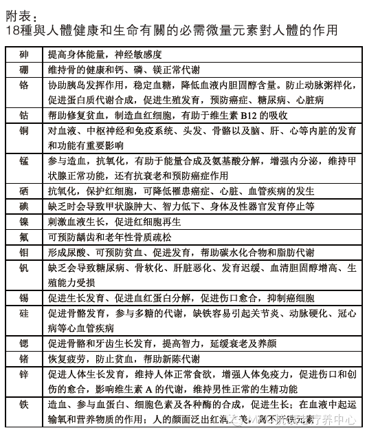 微量元素与人类健康有密切关系。它们的摄入过量、不足、或缺乏都会不同程度地引起人体生理的异常或发生疾病。微量元素最突出的作用是与生命活力密切相关,仅仅像火柴头那样大小或更少的量就能发挥巨大的生理作用。根据科学研究,到目前为止,已被确认与人体健康和生命有关的必需微量元素有18种,即有铁、铜、锌、钴、锰、铬、硒、碘、镍、氟、钼、钒、锡、硅、锶、硼、铷、砷等。这每种微量元素都有其特殊的生理功能。